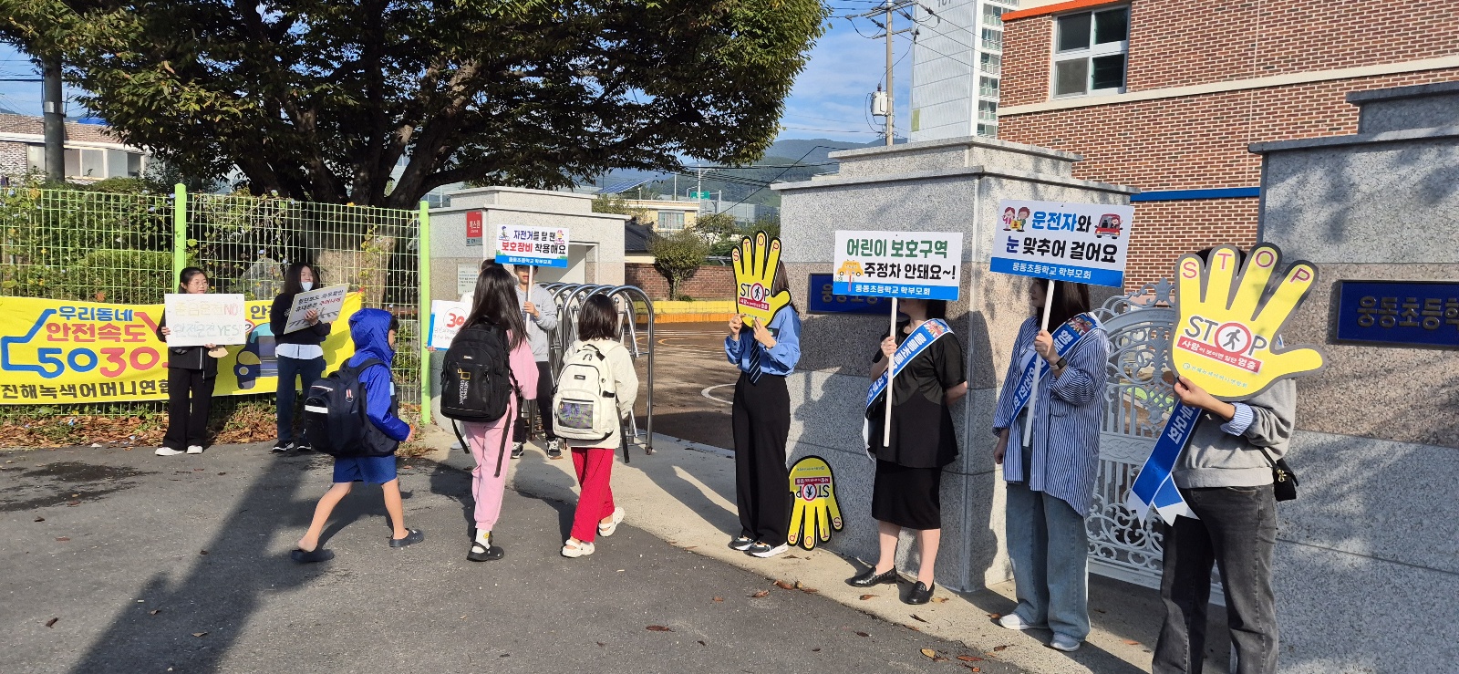 진해 경찰서, 진해 녹색어머니연합회, 웅동초 학부모회, 웅동초 학생들이 함께하는 교통안전 합동캠페인 모습입니다.
